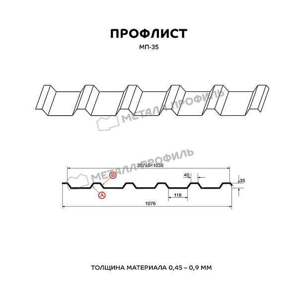 Профлист МЕТАЛЛ ПРОФИЛЬ МП-35x1035-B NormanMP (ПЭ-01-9003-0,5) — популярный материал для оформления профилированного листа. Представляет собой стальной оцинкованный лист с покрытием. Толщина стальной основы с цинковым и защитно-декоративным слоем — 0.5 мм. Проходя процедуру холодного проката, металл приобретает рисунок из ритмичных волн. Такая форма придает профилю несущую способность.Профиль МП-35: