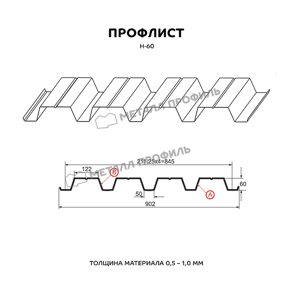 Профлист МЕТАЛЛ ПРОФИЛЬ Н-60x845-A (ПЭ-01-3009-0,7) часто используется для монтажа профилированного листа. Изначально он представляет собой металлический оцинкованный лист с покрытием. Толщина стальной основы с оцинковкой и полимерным слоем — 0.7 мм. Проходя процедуру холодного проката, металл принимает волнообразный вид. Жёсткость такого листа гораздо выше плоского.